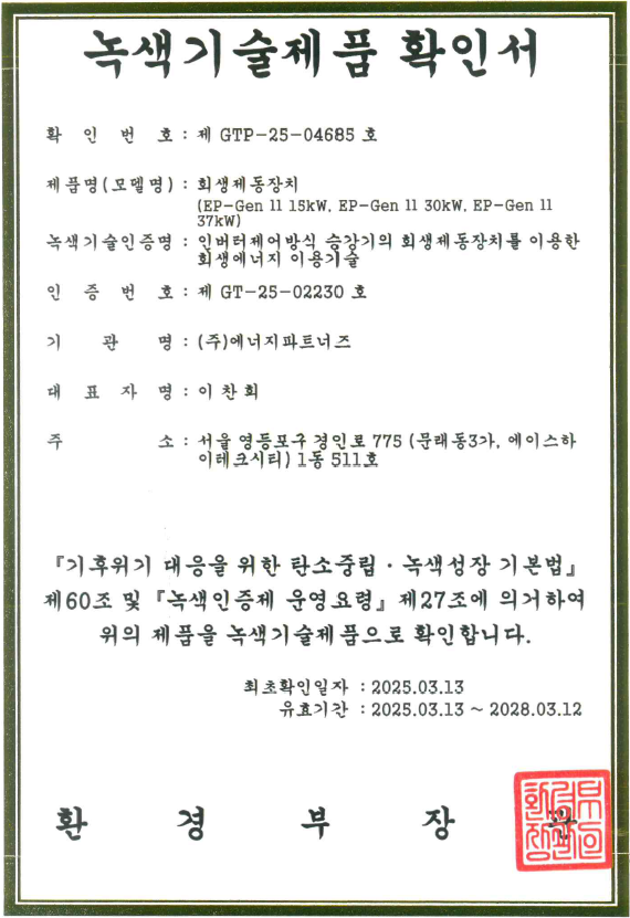 EP-Gen : 15kW / 1대, 30kW / 1대 주소 : 대전시 서구 청사로 189공사완료일 : 2024-12-31