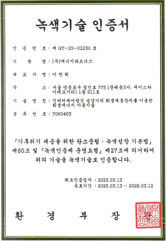 한국승강기안전공단EP-Gen : 15kW / 1대 주소 : 경상남도 진주시 소호로 102 완공일 : 2021-11-5